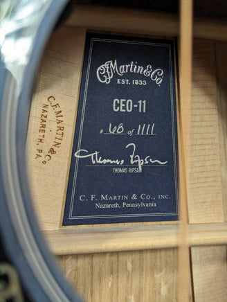 The Martin CEO-11 is a striking, limited-edition acoustic-electric that blends artistry and craftsmanship in a way only Martin can. Designed by President and CEO Thomas Ripsam, this Grand Auditorium (M) model features a figured white oak multi-piece back and sides paired with an FSC®-certified European spruce top, offering a rich, dynamic sound that’s both powerful and warm. The eye-catching New Horizons blue burst top and dark mahogany-colored sides create a look that’s as bold as the sound it creates. Unique inlays, including a custom Unalome symbol on the headplate, add a personal touch that speaks to finding your creative path. With a two-piece flamed maple neck, European flamed maple binding, and scalloped spruce X bracing, the CEO-11 invites you to connect with your sound and express yourself fully. It’s equipped with Fishman® Aura VT Blend electronics, custom-voiced to Thomas’ preference, ensuring that its tone stands out wherever you play. The number 11, a “master number” that symbolizes intuition and creativity, aligned perfectly with the guitar’s artistic vision, acting as a subtle reminder of the journey every artist takes to find their true voice. Limited to only 1,111 models, the CEO-11 is built for players looking to make a statement – sonically and visually – while staying true to Martin’s legacy of unleashing the artist within. Each guitar includes a blue paper label signed and numbered by Thomas and a molded hardshell case.