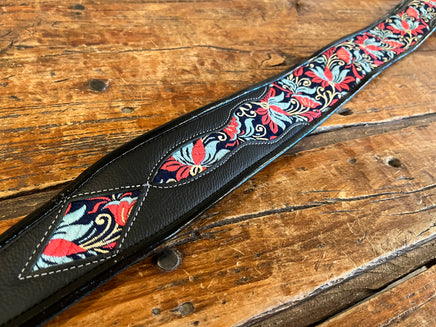 Made by hand in our shop in NYC. 2.5" wide lush, metallic brocade straps. Leather lining with complete leather body and leather binding. Fully adjustable tail to 55" long (60" length available).