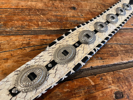 Made by hand in our shop in NYC. 3" snake skin straps with nickel conchos and handlacing. Leather lining with complete leather body. Fully adjustable tail to 55" long (60" length available).