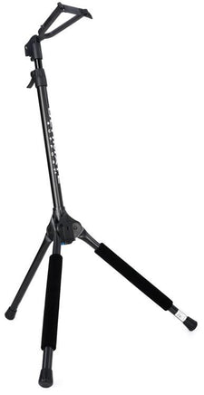Get a truly innovative, unique guitar stand with the GS-100+ Guitar Stand from Ultimate Support. The GS-100+ features a yoke with a safety strap that securely holds your instrument’s headstock when not in use. Protective padding on the legs of this stand also ensures that your guitar’s surface does not get damaged. A new push-button, leg-locking mechanism locks the entire tripod in place, ensuring even more stability. When you are ready to go, simply push the button and the tripod folds up easily for transport! This amazing stand is also height-adjustable